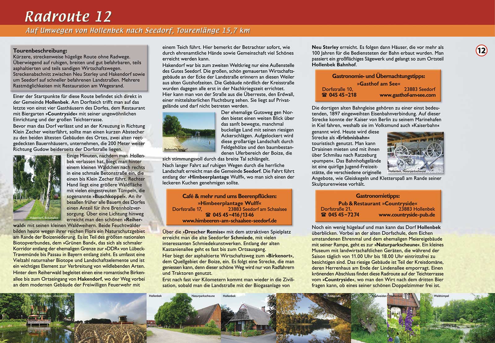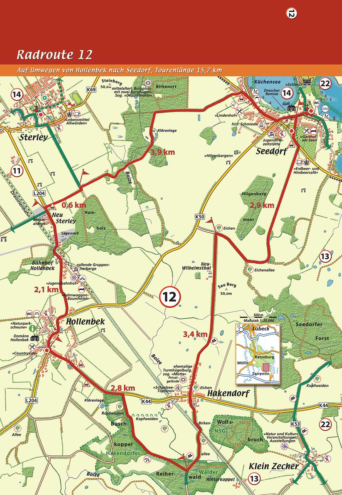 Kürzere, streckenweise hügelige Route ohne Radwege. Überwiegend auf ruhigen, breiten und gut befahrenen, teils asphaltierten und teils sandigen Wirtschaftswegen. Streckenabschnitt zwischen Neu Sterley und Hakendorf sowie um Seedorf auf schneller befahrenen Landstraßen. Mehrere Rastmöglichkeiten mit Restauration am Wegesrand. Tourenlänge: 15,7 km