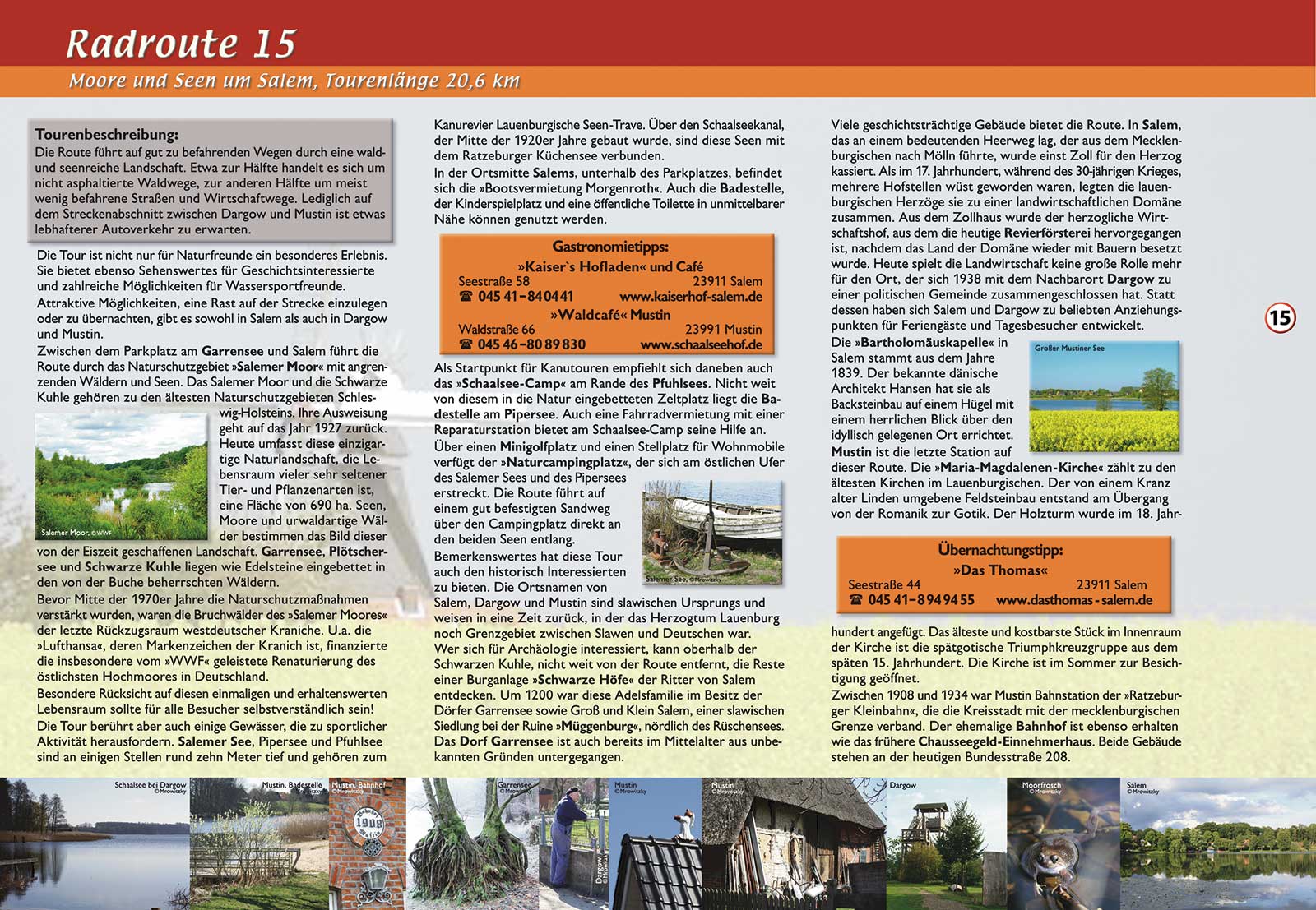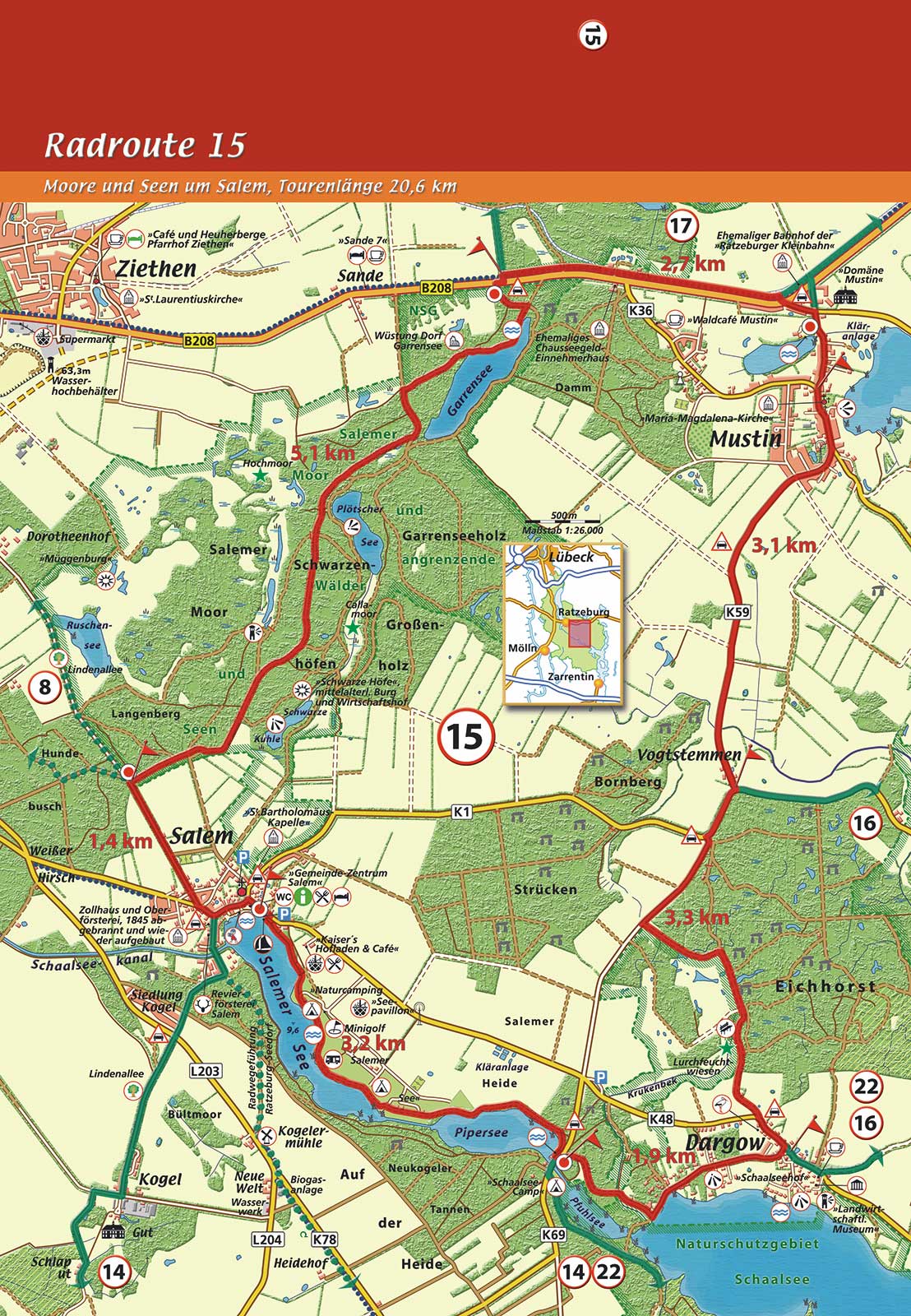 Die Route führt auf gut zu befahrenen Wegen durch eine wald- und seenreiche Landschaft. Etwa zur Hälfte handelt es sich um nicht asphaltierte Waldwege, zur anderen Hälfte um meist wenig befahrene Straßen und Wirtschaftswege. Lediglich auf dem Streckenabschnitt zwischen Dargow und Mustin ist etwas lebhafterer Autoverkehr zu erwarten. Tourenlänge: 20,6 km